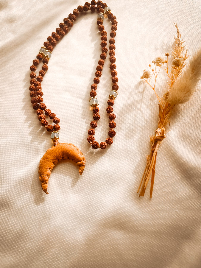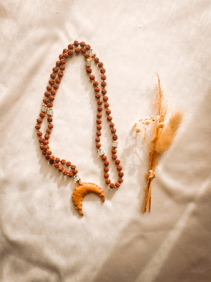 Portes la lune près de ton cœur avec le Mala Talismoon en rudraksha, conçu en Haute-Savoie et façonné à Bali. Orné d’une lune en cuir sacré de Bali, ce mala artisanal unique te connecte aux énergies subtiles de la lune, parfait pour les méditations et rituels lunaires.